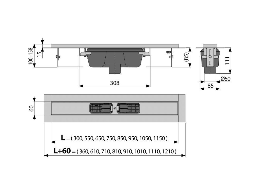 ALCA Podlahový žľab s okrajom pre perforovaný rošt, vertikálny odtok APZ1001-300