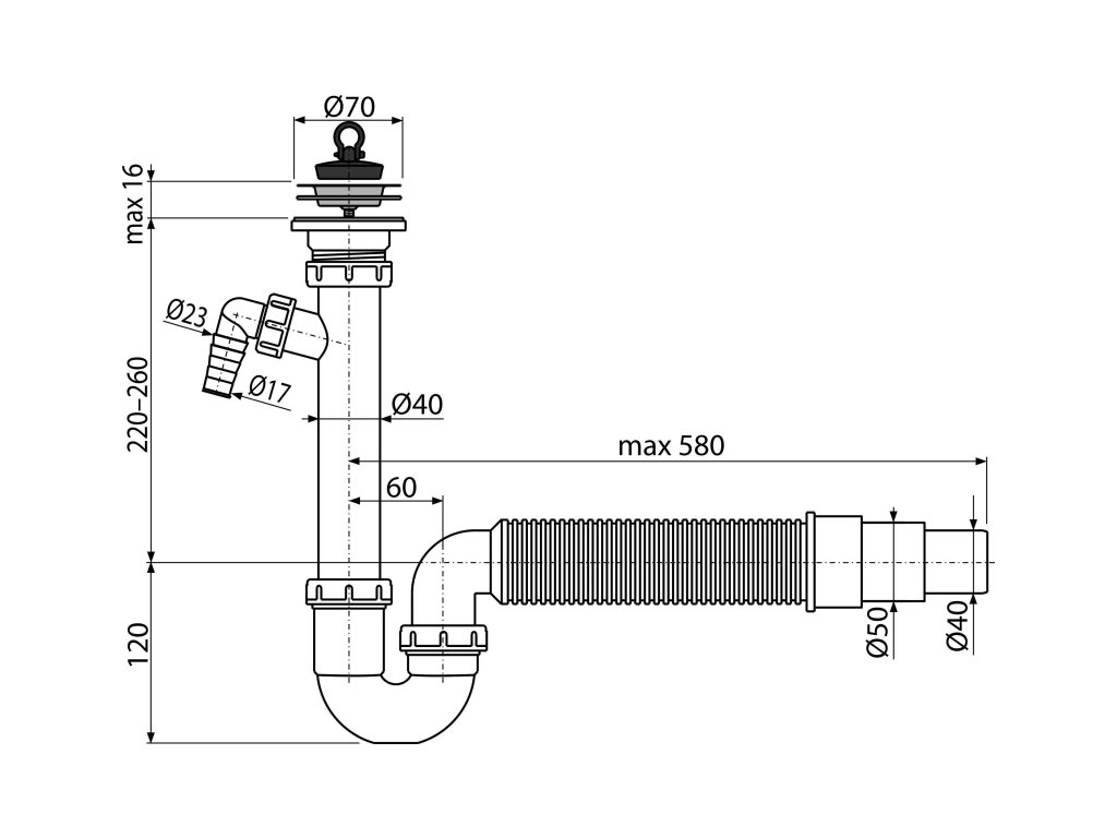 ALCA Potrubný sifón s nerezovou mriežkou DN70, prípojkou a flexi hadicou A830-DN50/40