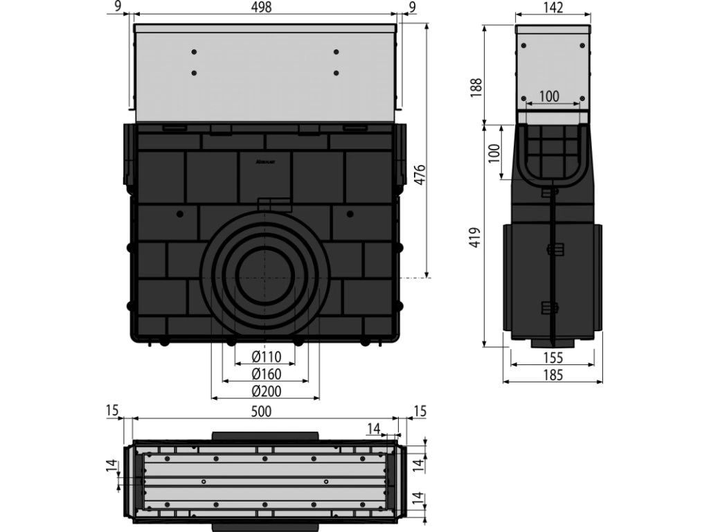 - Bočné pripojenie na odpad Ø110, 160, 200 mm