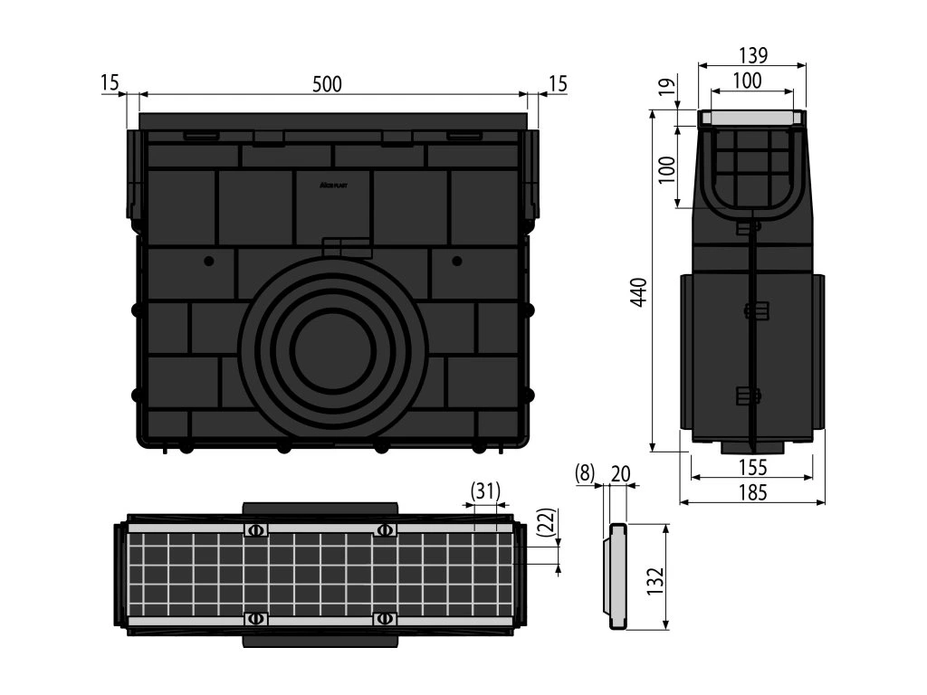 - Bočné pripojenie na odpad Ø110, 160, 200 mm