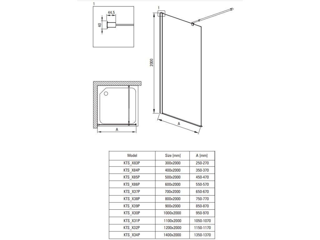 Tabuľka rozmerov sprchového kúta Kerria Plus Walk-In