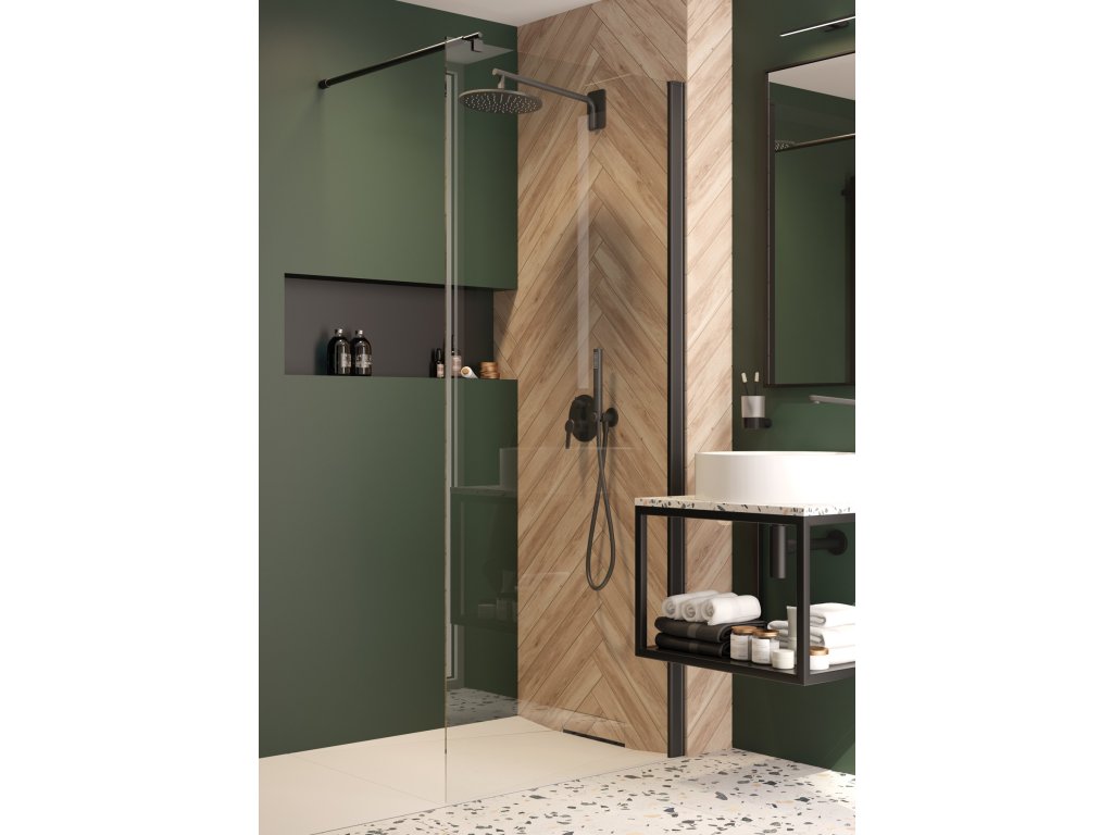 Sprchová stena KERRIA PLUS walk-in v elegantnej čiernej farbe je symbolom moderného dizajnu a spoľahlivej funkčnosti. Možno ju inštalovať so sprchovou vaničkou alebo bez nej a možno ju kombinovať s inými sprchovými stenami z rovnakého radu. Stena je vyrobená zo 6 mm hrubého tvrdeného skla Totalwhite a potiahnutá vrstvou Active Cover, vďaka ktorej povrch skla odpudzuje vodu a nečistoty a urýchľuje odtok vody. Walk-in možno použiť ako samostatnú stenu alebo ako súčasť sprchového kúta.