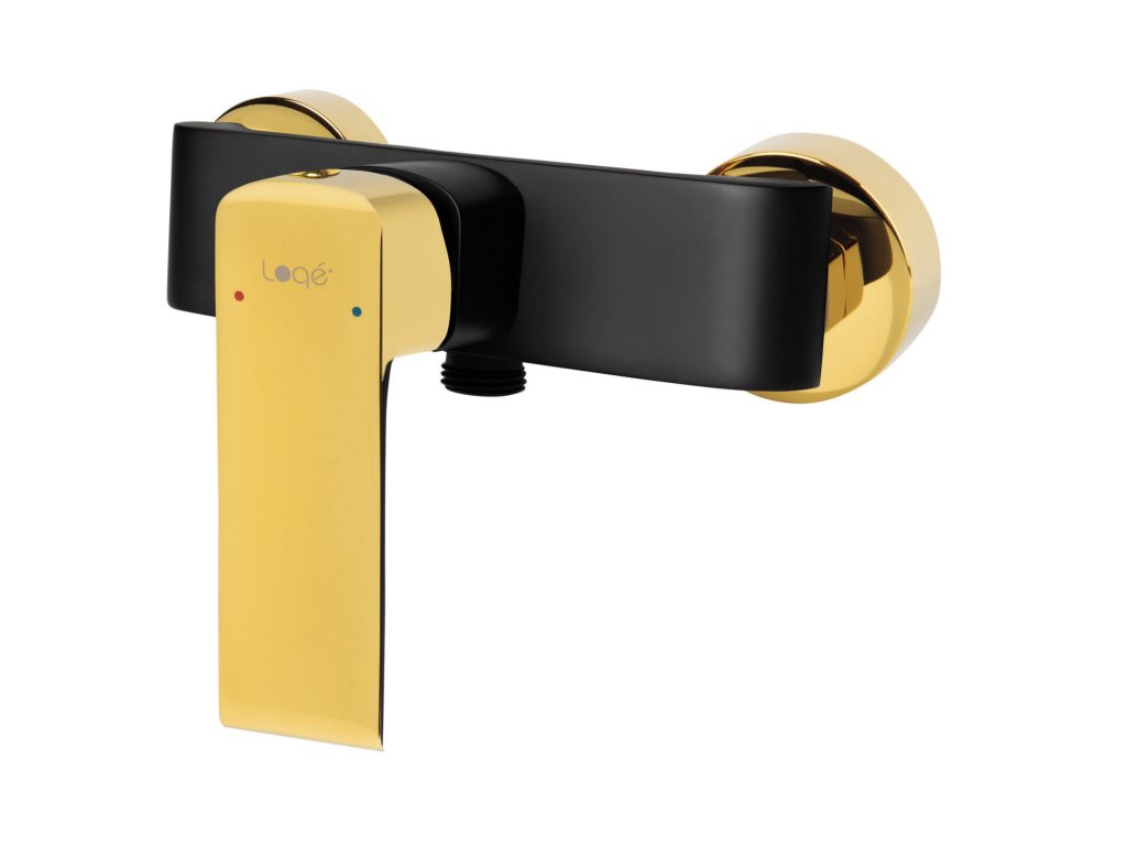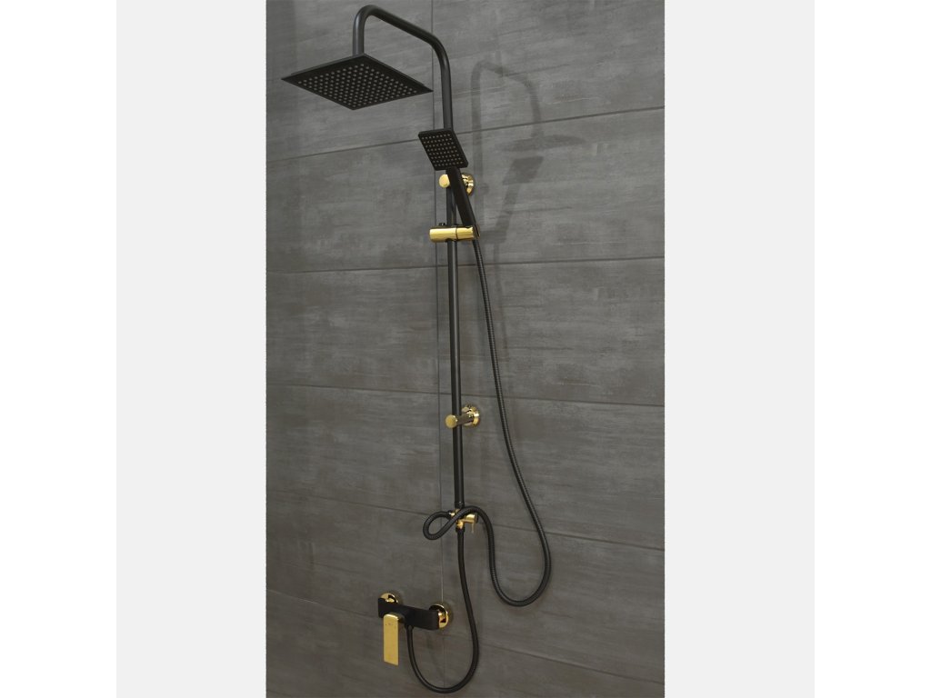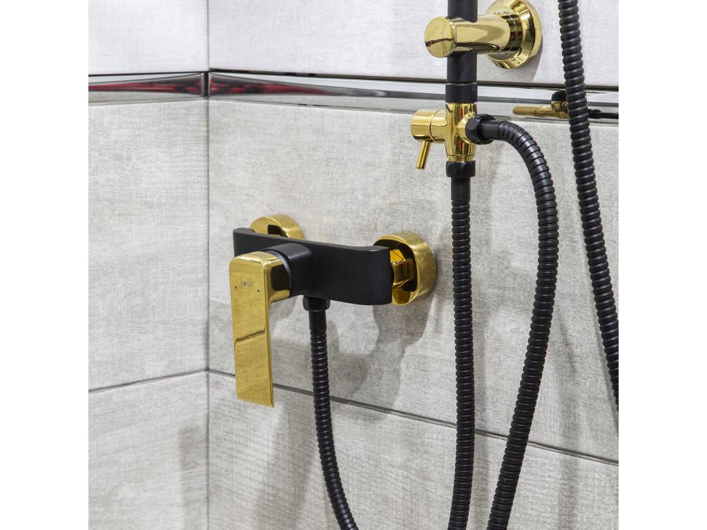 - sprchová batéria v čiernej a zlatej farbe