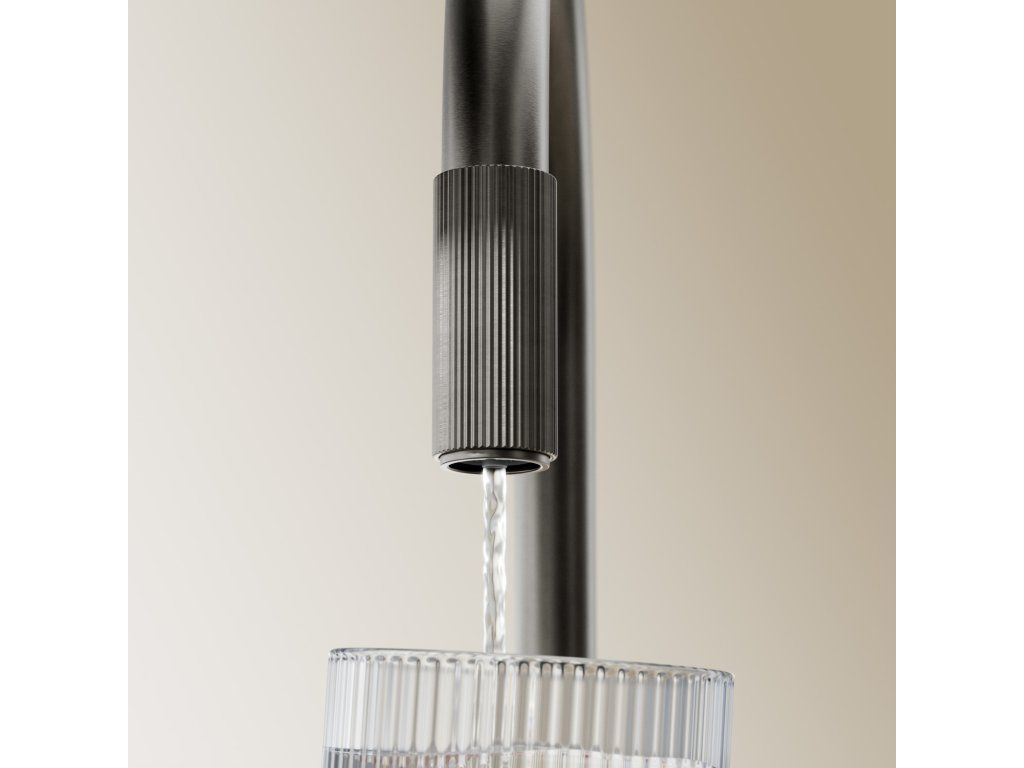 Drezová batéria SWITCH spája minimalistický dizajn založený na vyvážených proporciách s praktickou funkčnosťou, ktorá zabezpečuje pravidelný prísun vody a filtráciu. Jasne definované a precízne spracované detaily umožňujú intuitívne používanie tým, že poukazujú na dva samostatné prúdy vody: normálnu vodu v blízkosti páky a filtrovanú vodu na konci výtoku - stačí otočiť rebrovaným krúžkom výtoku a rýchlo naplniť pohár lahodnou čerstvou pitnou vodou.