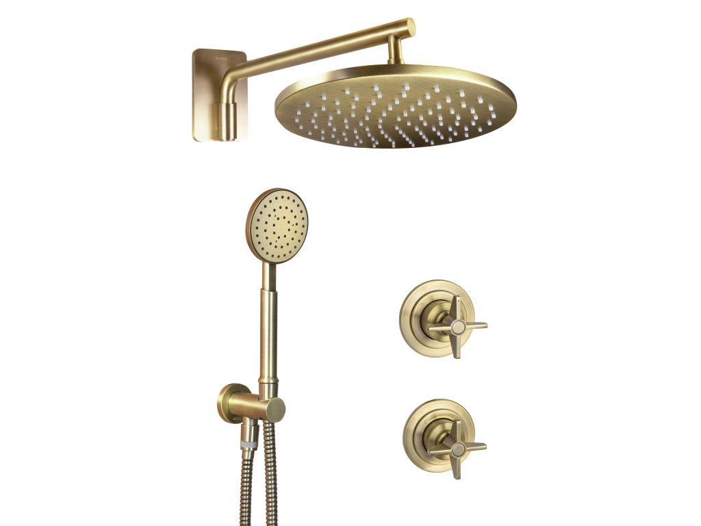 Skrytá súprava sa skladá z mosadznej hlavovej sprchy, sprchovej hlavice, nástenného vývodu, sprchovej hadice a jednopákovej batérie s prepínačom prietoku. Batéria je vybavená progresívnou hlavovou sprchou, princípy jej fungovania sú uvedené v nasledujúcom videu. Ručná sprcha a sprchová hlavica sú vybavené systémom proti usadzovaniu vodného kameňa, vďaka ktorému sa ľahko udržiavajú v čistote. Mosadzná povrchová úprava dodá vašej kúpeľni originálny vzhľad. Pri kúpe súpravy si môžete byť istí, že všetko do seba dokonale zapadá.