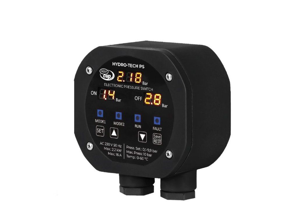 Zabezpečuje automatické ovládanie čerpadla. Nahrádza tlakový spínač s jednoduchým nastavením tlaku. Zobrazuje hodnoty tlaku a indikáciu režimu. Umožňuje nastavenie ochrany proti chodu nasucho. zapínací tlak: 0,3 - 9,7 baru vypínací tlak: 0,5 - 9,9 baru ochrana proti chodu nasucho automatická údržba - funkcia proti dlhodobej nečinnosti čerpadlaDodatočné parametre