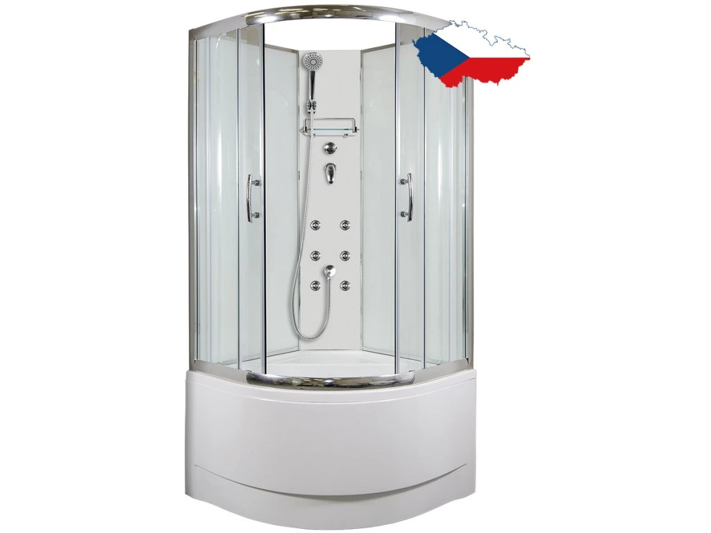 ARTTEC CALYPSO MODEL 4 číry masážny sprchový box vlastnej výroby s posuvnými dverami, štvrťkruhový, sa vyznačuje vysokou kvalitou a jednoduchým dizajnom. Ponúka všetko, čo potrebujete na pohodlné každodenné sprchovanie: batériu s ručnou sprchou a držiakom, poličku a vysokú vaničku. Je tiež vybavená 6 masážnymi tryskami na dodatočnú relaxáciu.