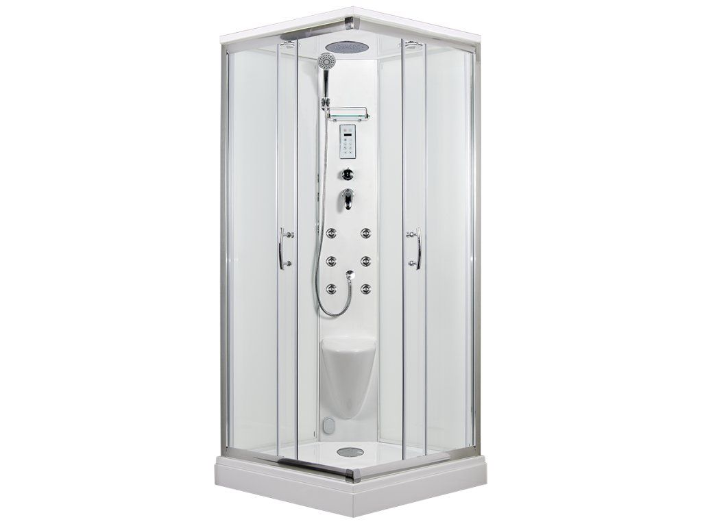 Špičkovým modelom z radu SMARAGD je parný sprchový box s masážnymi tryskami. Ide teda o sprchovacie a masážne zariadenie s vlastnosťami parnej sauny. Základom tohto boxu je kvalitná štvorcová vaňa z liateho mramoru (87 x 87 x 3 cm), ktorá je osadená na oceľovom ráme s nastaviteľnými nožičkami. Vďaka oceľovému rámu a použitiu kvalitného materiálu má vanička z liateho mramoru nosnosť 300 kg. Rám sprchovej vaničky je zakrytý 10 cm vysokým krycím panelom. Panel je vyrobený z rovnakého povrchového materiálu ako vanička, takže sa v ňom nevyskytujú žiadne farebné rozdiely. Predný panel je odnímateľný, a preto je v prípade potreby prístupný zdola aj zhora. Pôdorysná plocha vaničky je vysoká 13 cm a pohodlný vstup do parného sprchového boxu zabezpečuje mimoriadne široký vstup s dĺžkou 48 cm. Bezpečnostné tvrdené sklo s hrúbkou 5 mm je zasadené do elegantného hliníkového rámu. Hliníkový rám je odolný voči korózii. Posuvné dvere sú vybavené dvojitými pojazdnými kolieskami na jednoduché otváranie. Spodné kolieska sú otočné pre jednoduchú údržbu. Zadné sklo parného boxu je super biele nepriehľadné.