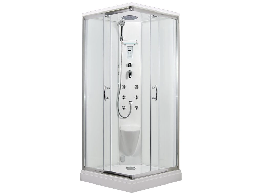 Sprchový box s rozmermi 87 x 87 x 220 cm sa dá ľahko inštalovať aj do veľmi malých priestorov kúpeľní v panelových domoch. Je možné ho pripojiť na spoločný klimatizačný systém v dome.