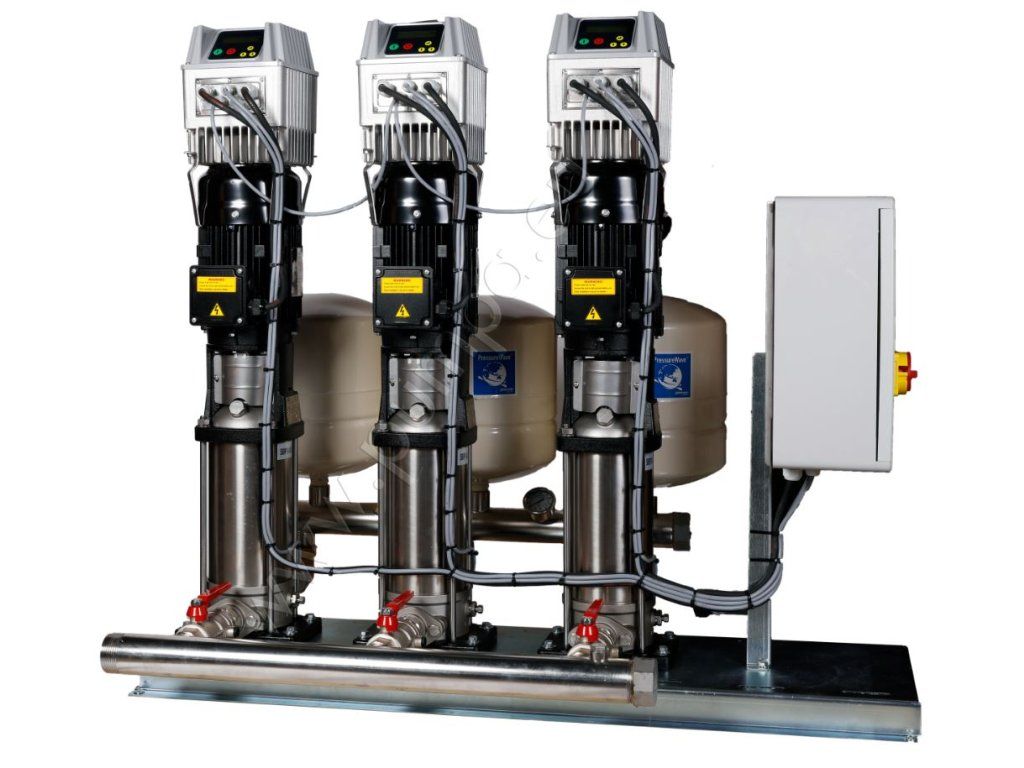- 3 paralelne zapojené vertikálne odstredivé čerpadlá z nehrdzavejúcej ocele namontované na spoločnom základnom ráme