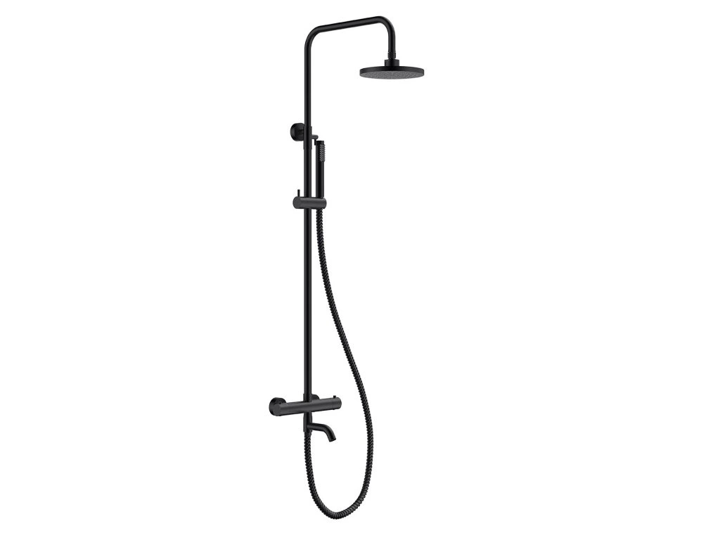 - Set obsahuje termostatickú batériu, hlavovú sprchu s držiakom, ručnú sprchu, hadicu a otočné výtokové ramienko.