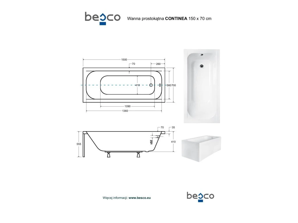 BESCO Obdĺžniková vaňa CONTINEA Nožičky k vani - S nožičkami, Rozmer vane - 150 × 70 cm VANCONT150+OLVPINOZ