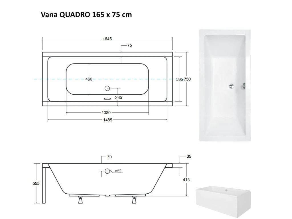 BESCO Obdĺžniková vaňa QUADRO Nožičky k vani - S nožičkami, Rozmer vane - 165 × 75 cm VANQAUD165+OLVPINOZ