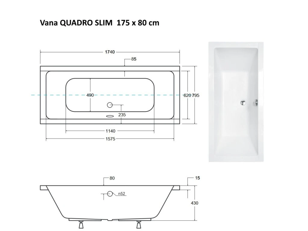 BESCO Obdĺžniková vaňa QUADRO SLIM Nožičky k vani - Bez nožičiek, Rozmer vane - 175 × 80 cm VANQAUD175SLIM