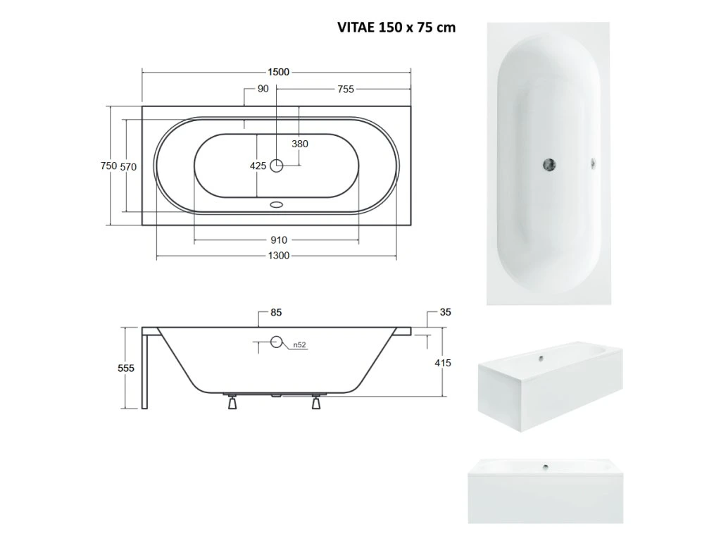 BESCO Obdĺžniková vaňa VITAE Nožičky k vani - S nožičkami, Rozmer vane - 150 × 75 cm VANVITAE150+OLVPINOZ