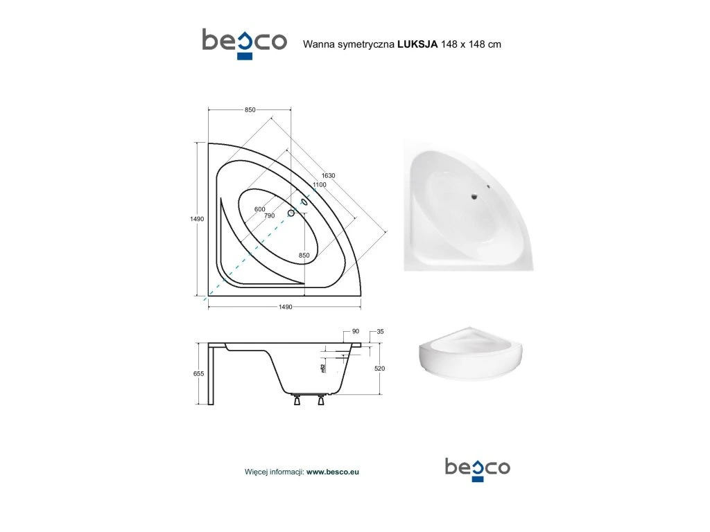 BESCO Rohová vaňa LUKSJA Nožičky k vani - S nožičkami, Rozmer vane - 148 × 148 cm VANLUK150+OLVPINOZSTELWD