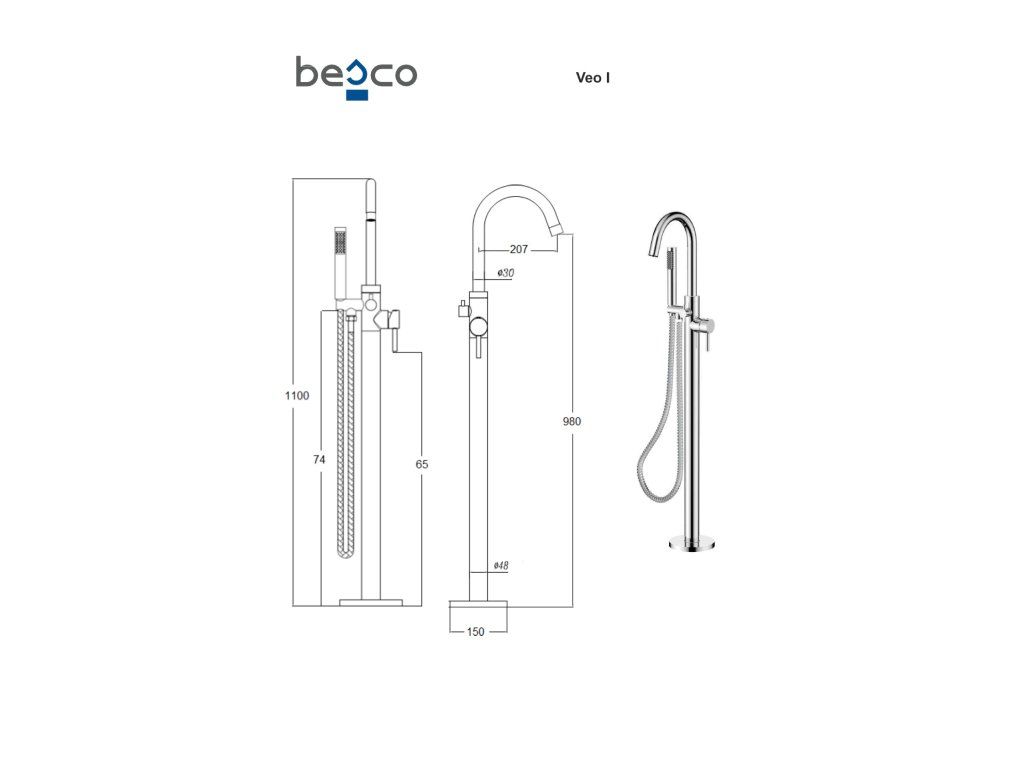 Vaňová stojanková batéria je dodávaná vrátane príslušenstva (montážny box, sprchová ružica a hadica) . Jednoduchá montáž do podlahy vďaka inštalačnému boxu, ktorý je súčasťou balenia batérie.