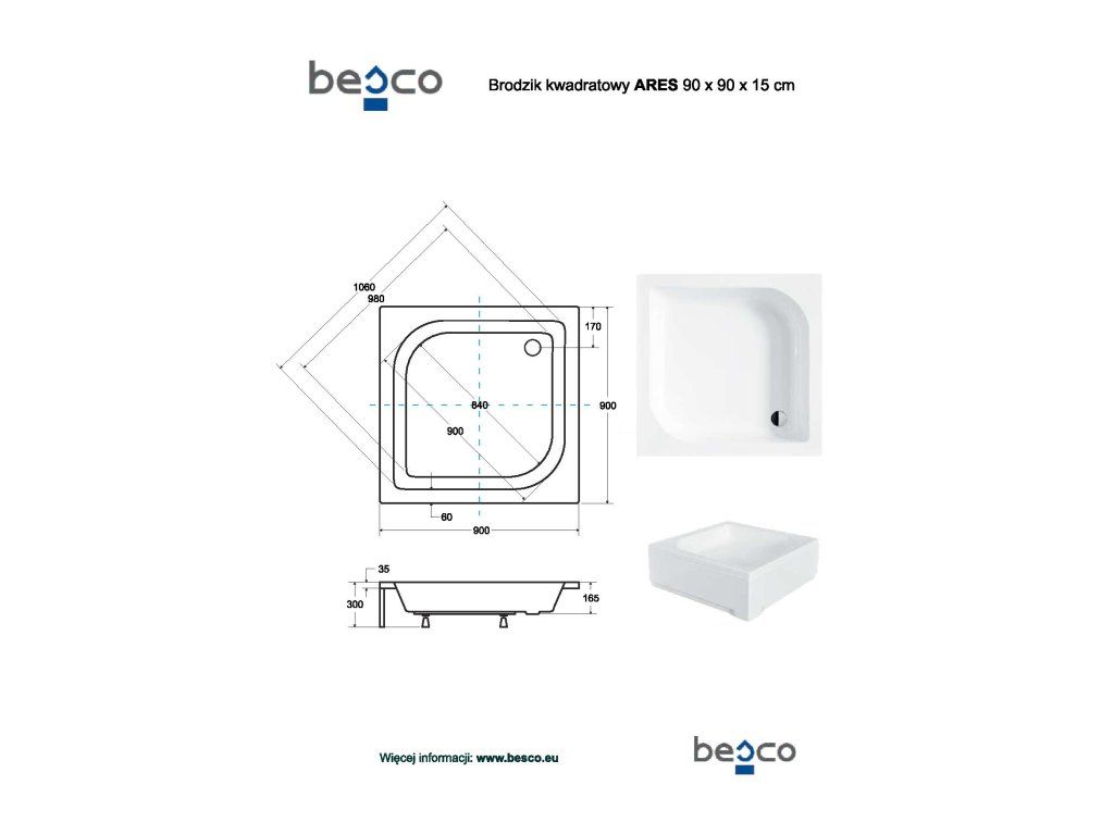 BESCO Štvorcová sprchová vanička ARES Nožičky k vani - S nožičkami, Rozmer A - 90 cm, Rozmer B - 90 cm VANKARES90