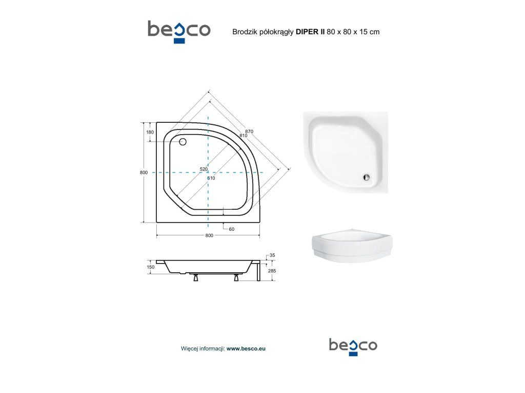 BESCO Štvrťkruhová sprchová vanička DIPER II Nožičky k vani - S nožičkami, Rozmer A - 80 cm, Rozmer B - 80 cm VANKDIPERII80