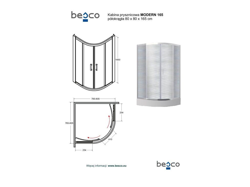 Štvrťkruhový sprchovací kút MODERN 165 (bez vaničky) vyniká vysoko kvalitným spracovaním a spoľahlivou funkčnosťou všetkých súčastí a materiálov. Zástena s výškou 165 cm je určená pre vaničky DIPER I a DIPER II.