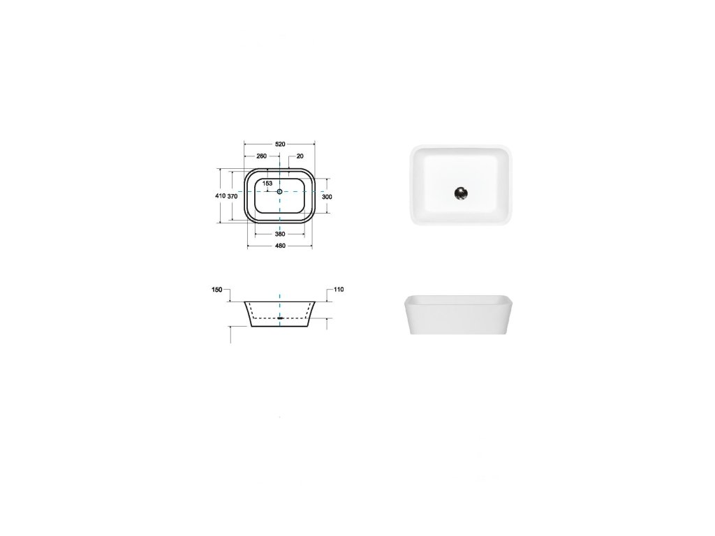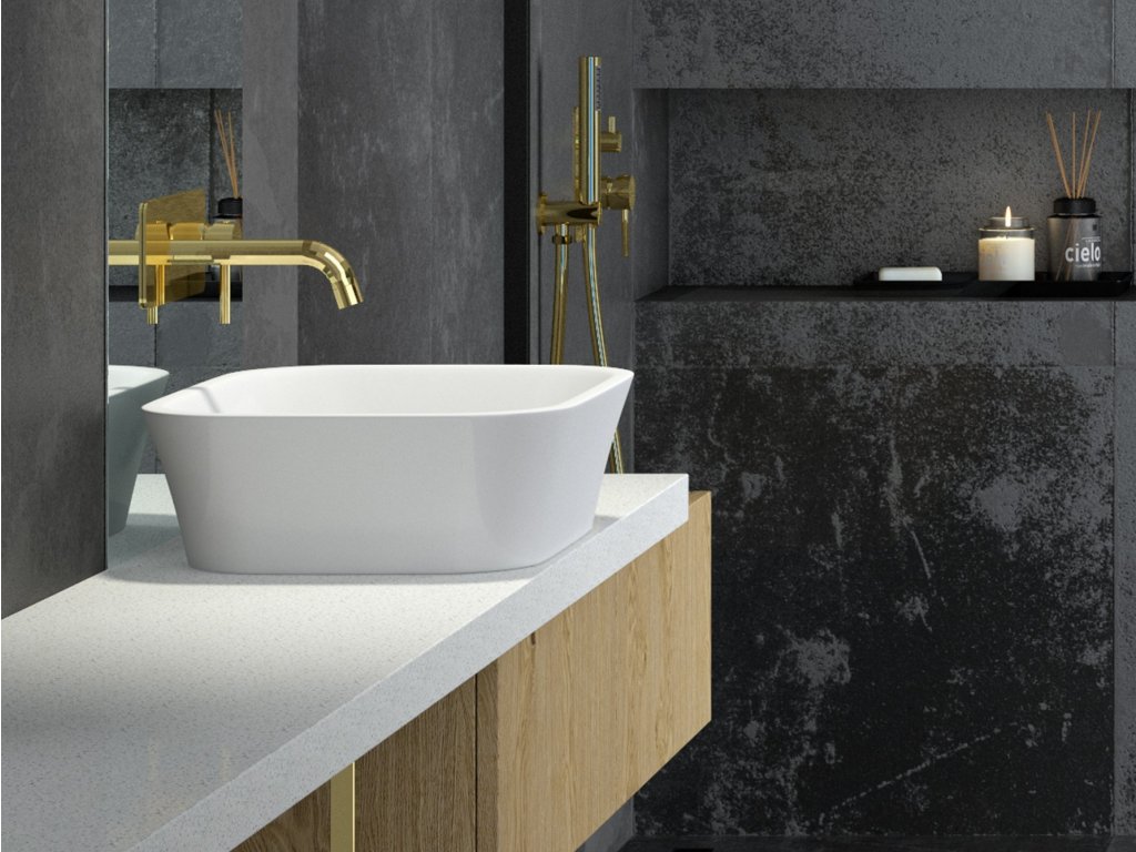 Umývadlo ASSOS na dosku nemá otvor pre stojančekovú batériu, pre elegantné riešenie môžete použiť umývadlové podomietkové batérie, alebo umývadlové vysoké stojančekové batérie.