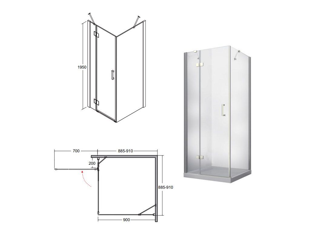 Bezrámový štvorcový sprchový kút s 8 mm hrubým čírym sklom so špeciálnou úpravou, ktorá uľahčuje čistenie skla. Sprchový kút sa otvára do priestoru a je možné pravé aj ľavé vyhotovenie. Vysokokvalitné chrómové pánty a magnetické tesnenia zabezpečujú špičkovú eleganciu a funkčnosť. Vďaka chrómovej odkvapkávacej vaničke voda vždy odteká do vane.