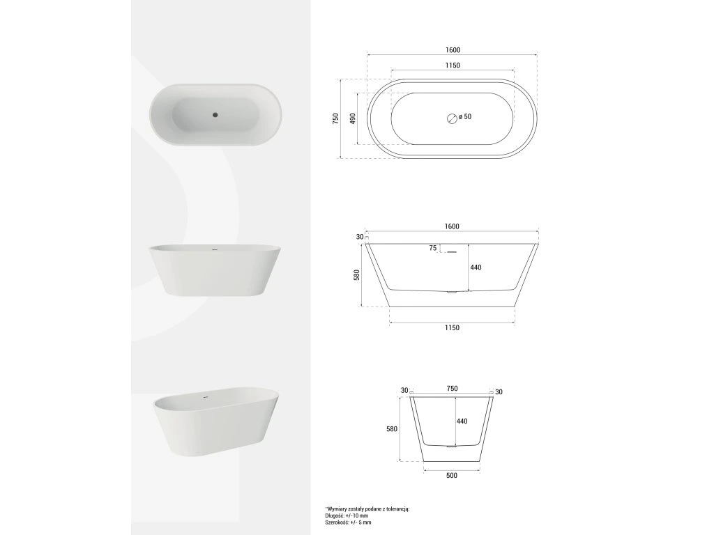 BESCO Voľne stojaca vaňa DEEVA biela Farba - Biela, Farba sifónu - Grafitová, Rozmer vane - 160 × 75 cm VANDEEVA160G
