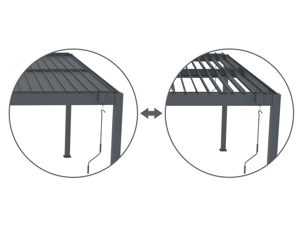 Vďaka manuálne ovládaným lamelám z pozinkovanej ocele si môžete ľahko nastaviť ideálne podmienky podľa aktuálneho počasia. Rozsah sklonu až do 110° umožňuje efektívnu cirkuláciu vzduchu a spoľahlivú ochranu pred dažďom alebo slnečným žiarením. Pergola tak poskytuje príjemné prostredie počas horúcich letných dní a v nepriaznivom počasí.