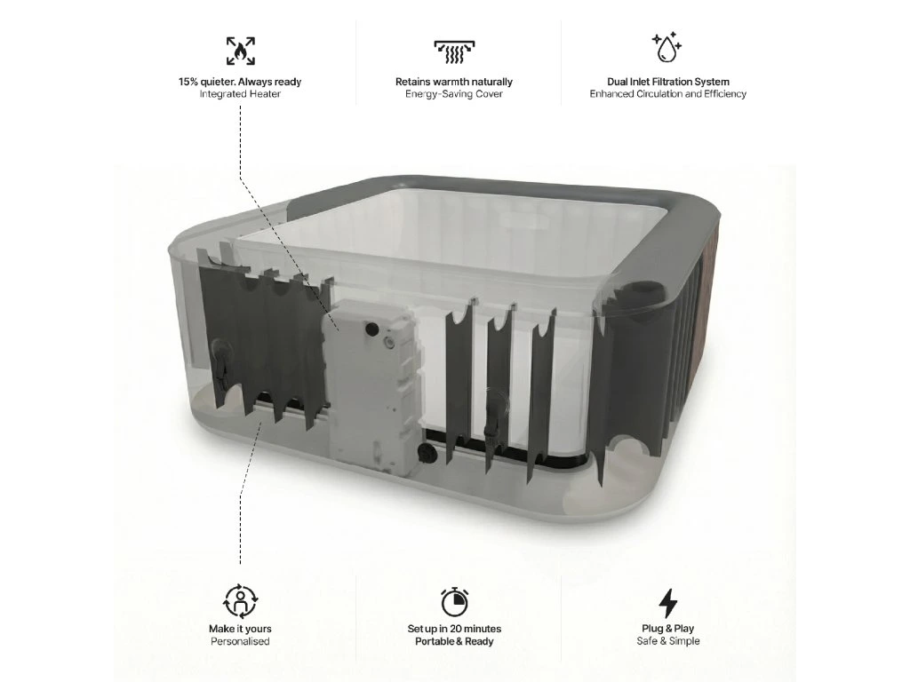 S vírivkou CFWave Pacific premeníte svoju záhradu, terasu alebo interiér na miesto dokonalej relaxácie. Tento moderný model spája inteligentnú technológiu, úspornú prevádzku a premyslený dizajn, aby vám priniesol maximálny komfort bez zbytočných kompromisov. na prvý pohľad vás zaujme štvorcový tvar, ktorý nie je len dizajnovým prvkom, ale predovšetkým praktickým riešením. V porovnaní s klasickými okrúhlymi vírivkami efektívne využíva priestor - dokonale zapadne do rohov terasy alebo záhrady a eliminuje nevyužité "mŕtve zóny". Výsledkom je viac priestoru pre vás a vašich blízkych. srdcom vírivky je integrovaný filtračný a vykurovací systém, ktorý je zabudovaný priamo v konštrukcii. Tým sa eliminuje potreba externých jednotiek, hadíc alebo technických zariadení v okolí vírivky. Inštalácia je čistá, jednoduchá a esteticky nenápadná. Váš prehliadač nepodporuje video. Ďalšou veľkou výhodou je energetická účinnosť, ktorá môže byť až o 50 % lepšia ako u bežných konkurenčných víriviek. Vďaka optimalizovanému systému ohrevu a cirkulácie vody si môžete pravidelne užívať relax bez obáv z vysokých prevádzkových nákladov. vírivka Wave Pacific je navrhnutá ako riešenie plug & play, čo znamená, že ju môžete uviesť do prevádzky približne za 20 minút. Stačí ju rozbaliť, nafúknuť, naplniť vodou a zapojiť do bežnej elektrickej zásuvky. Nie sú potrebné žiadne zložité úpravy ani odborná inštalácia. maximálna teplota vody dosahuje až 40 °C, čo je ideálne na hlbokú relaxáciu, uvoľnenie svalov a regeneráciu po náročnom dni.Vďaka WiFi pripojeniu (návod na spárovanie zariadenia nájdete TU) môžete vírivku ovládať odkiaľkoľvek pomocou mobilnej aplikácie - nastavte teplotu, spustite ohrev alebo aktivujte bublinky ešte pred príchodom domov. Na relaxáciu budete vždy dokonale pripravení. Súčasťou balenia je aj izolačný kryt, ktorý pomáha udržiavať teplotu vody, chráni vírivku pred znečistením a zároveň zvyšuje energetickú účinnosť celej prevádzky.Kľúčové vlastnostiČtvercový dizajn bez zbytočného priestoru Vhodný pre 4 dospelé osoby Integrovaný filtračný a vykurovací systém Energeticky úsporná prevádzka (až -50 %) Ovládanie prostredníctvom mobilnej aplikácie (WiFi) Rýchla inštalácia Plug & Play Maximálna teplota vody 40 °C Súčasťou balenia je kryt na vírivku5 funkcií, ktoré oceníte v praxiČtvercový tvar - ideálny do rohov, lepšie využitie priestoru Plug & Play Pripojenie Play - žiadna zložitá inštalácia Ovládanie cez WiFi - zapnite ohrev odkiaľkoľvek Integrovaná filtrácia - žiadne externé boxy okolo vírivky Nízka spotreba energie - výrazná úspora nákladov5 dôvodov, prečo je Wave lepší ako konkurenciaLepšie využitie priestoru vďaka štvorcovému tvaru Zabudovaná technológia - nič neprekáža v okolí vírivky Až o 50 % úspornejšia prevádzka Rýchla inštalácia bez odborníka Moderné funkcie (WiFi, automatika, ochranné režimy)Technické parametre:Rozmery: 155 × 155 × 65 cm Vnútorné rozmery: 115 × 115 × 65 cm Hmotnosť bez vody: cca 24 kg Hmotnosť vody: cca 620 kg Počet trysiek: 110 Maximálna teplota: 40 °C Rýchlosť ohrevu: cca 1-1,5 °C/hodinu Napätie: 220-240 V / 50 Hz 12A Výkon ohrevu: cca 1800 W Výkon bubliniek: 600 W Prietok vody: 1325 l/h Funkcia: ohrev, filtrácia, bublinky Ochrana proti zamrznutiu: Detská poistka: ÁNO (ochrana proti zamrznutiu): Obsah baleniaVlnová vírivka Pacific Integrovaná vykurovacia a filtračná jednotka Kryt vírivky (pripínací) Filtračná vložka (2 ks) Nafukovacia hadica Ovládací panel Opravná súprava Pripojovacie príslušenstvoPrečo kupovať od CF GROUP Kúpa vírivky nie je len o výrobku - je to o dôvere.CF GROUP je špecialista na bazény a wellness technológie, ktorý vám poskytne:Odborné poradenstvo pred kúpou Záruku na originálny výrobok Servis a dostupnosť náhradných dielov Podporu pri inštalácii a prevádzke Dlhodobú istotu a bezpečnosť vašej investíciePri vírivke, ktorá pracuje s vodou, elektrinou a tlakom, je kvalitný predajca nevyhnutný.Dodatočné parametre