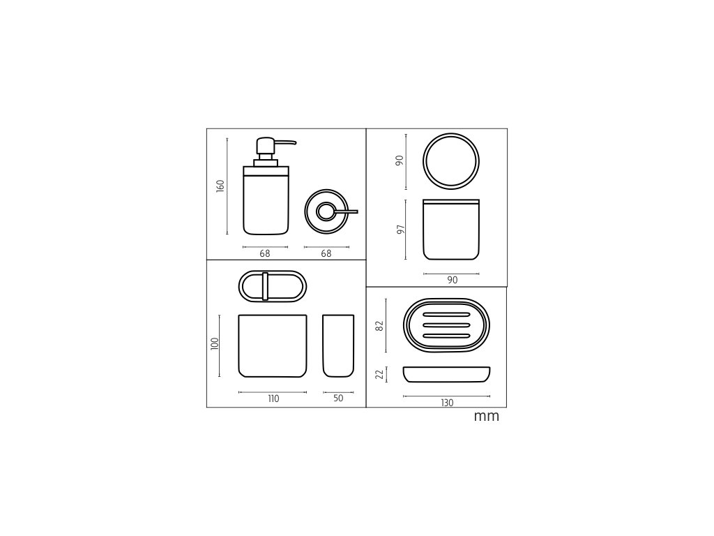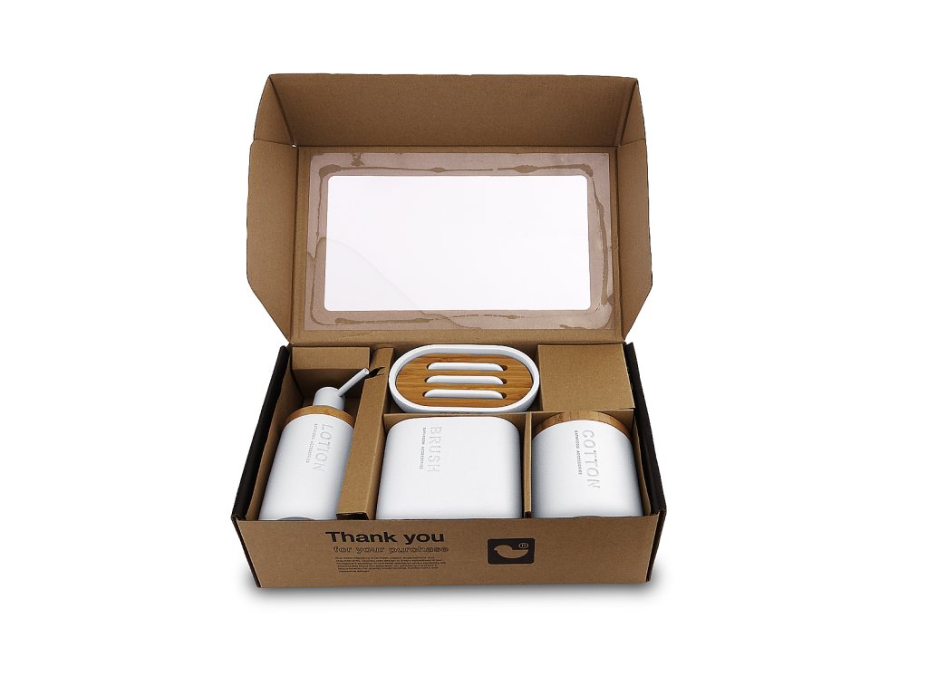 Obsahuje dávkovač, dávkovač mydla, dávkovač zubných kefiek a dávkovač tampónov. Farba biela.