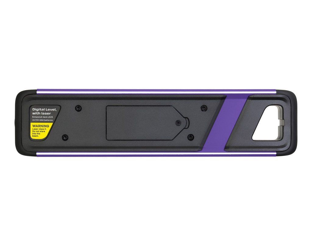 Vodováha je napájaná 2× batériami AAA a poskytuje až 12,5 hodiny prevádzky. Automatické vypnutie po 10 minútach nečinnosti šetrí energiu a indikátor batérií vás upozorní na ich vybitie. Závit 1/4" umožňuje jednoduché upevnenie na statív a magnetická základňa s V-drážkou zaisťuje pevné uchytenie na kovových povrchoch a rúrach.