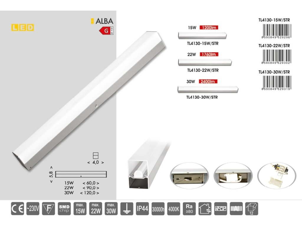 Nástenné svietidlo ALBA 15 W so svietivosťou 1200 lm a farbou svetla biela 4000 K, je určené na osvetlenie kúpeľní, kuchýň. Je odolné voči vlhkosti a má vodotesné krytie IP44. Svetlo je vyrobené z hliníka, kryt je z plastu. Svietidlo má štvorcový podlhovastý tvar a svieti z troch strán. Výborne sa hodí nad umývadlo so zrkadlom, kde dodáva luxusný dojem s veľkou svietivosťou. Pripája sa na kábel zo steny, ktorý sa zasunie do svorkovnice v strede spodnej časti svietidla.