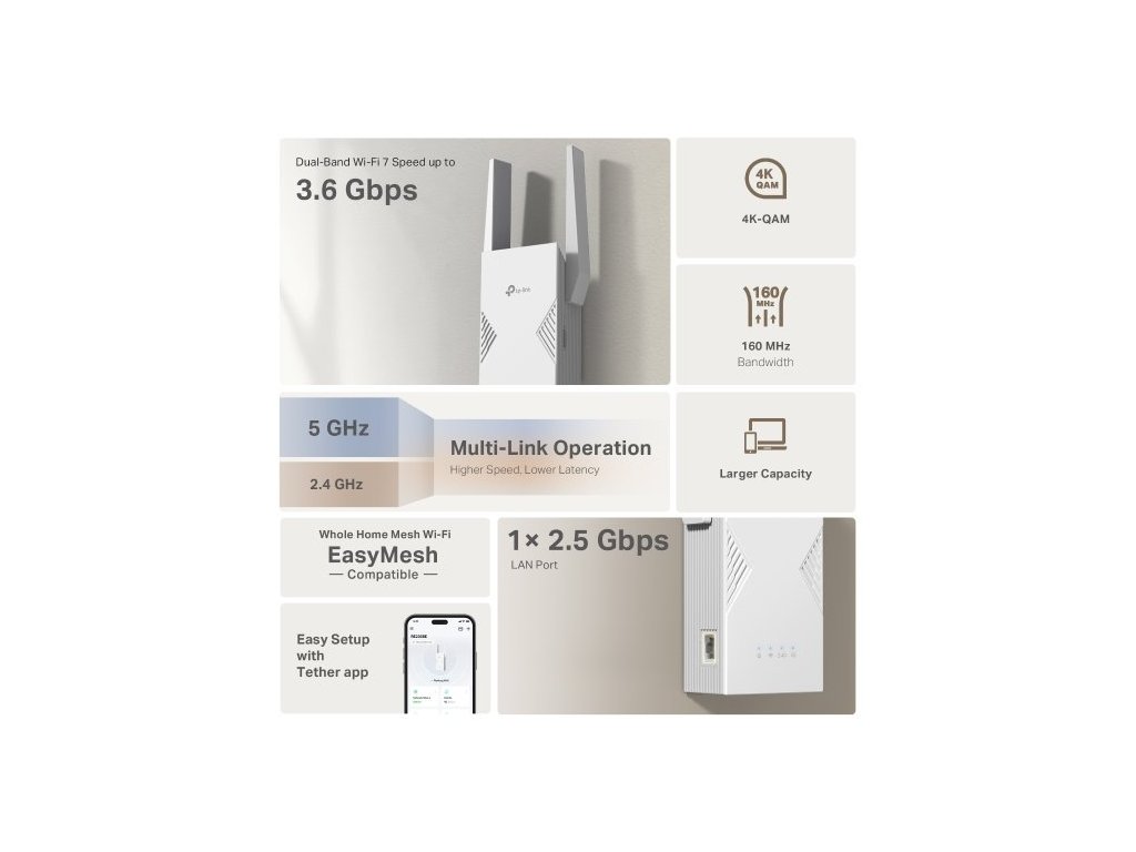 Extebder Wi-Fi s technológiou Wi-Fi 7, rýchlosťou 3,6 Gb/s, portom 2,5 Gb/s, EasyMesh, MLO, inteligentným roamingom, WPS, aplikáciou Tether.