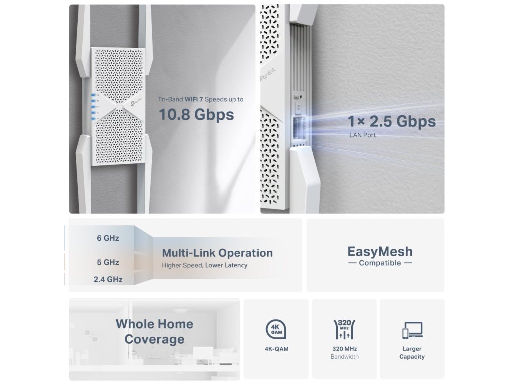 Rozšírenie Wi-Fi, trojpásmové pripojenie s rýchlosťou až 10,8 Gb/s (5 760 Mb/s v pásme 6 GHz, 4 230 Mb/s v pásme 5 GHz a 688 v pásme 2,4 GHz), 4 antény s vysokým ziskom, kompatibilné s EasyMesh.