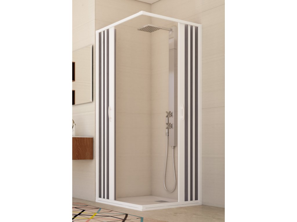Plastová štvorcová sprchová zástena GIOVE NEW so zatváraním do rohu. s rozmerovou a tvarovou variabilitou systému FLEX prináša maximálnu úsporu miesta do všetkých kúpeľní. Umožňujú to zhrňovacie transparentné profily - lamely, vsadené do vysoko kvalitného plastového rámu. Tento model ponúka dva typy zatvárania (na stranu/do stredu). Vďaka svojej odolnosti voči nárazom sú vhodné aj do hotelov a penziónov .