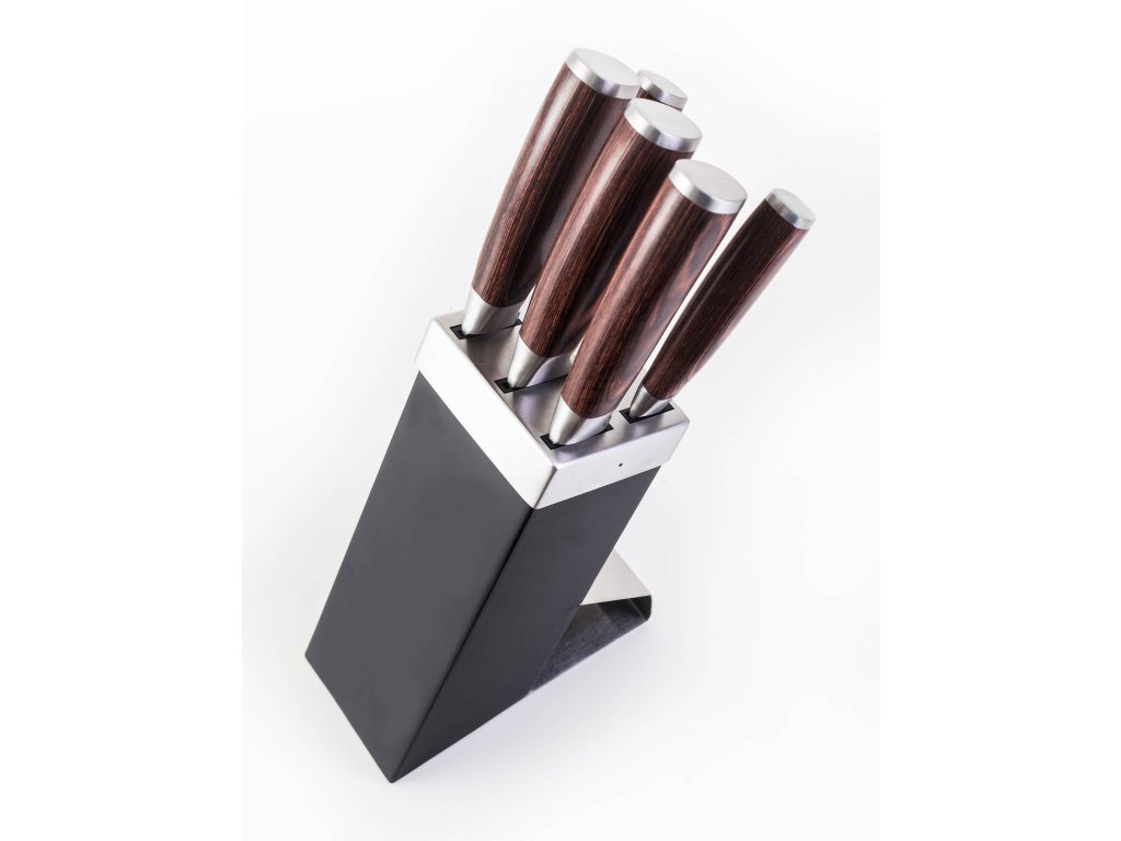 Nie ste si istí, kam bezpečne uložiť svoje nože? V stojane! Súprava sa dodáva s dizajnovým stojanom v čiernej a striebornej farbe. Každý nôž má v stojane svoje bezpečné miesto.