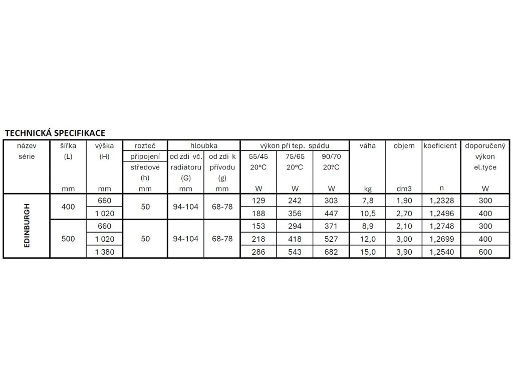 Dostupné rozmery a typy pripojenia radiátora EDINBURGH :