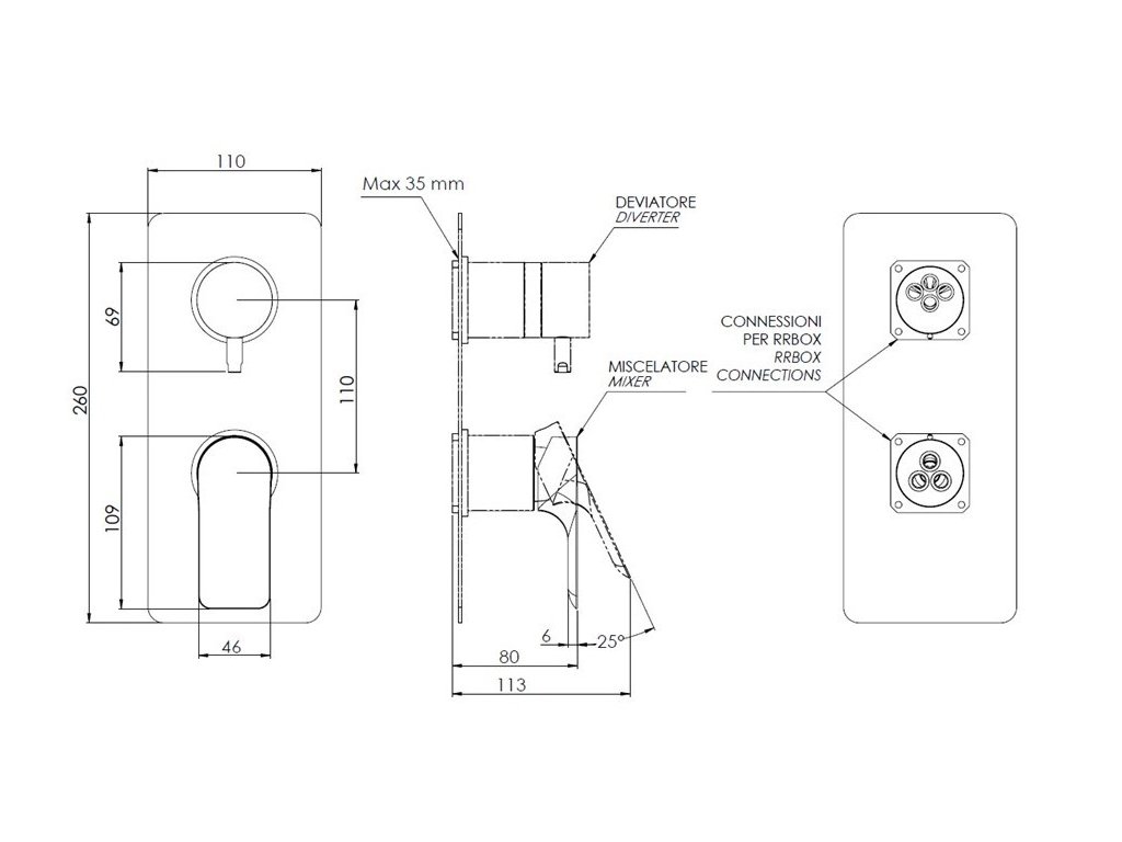 • Sprchová batéria podomietková, bez príslušenstva, s prepínačom, 3 výstupy