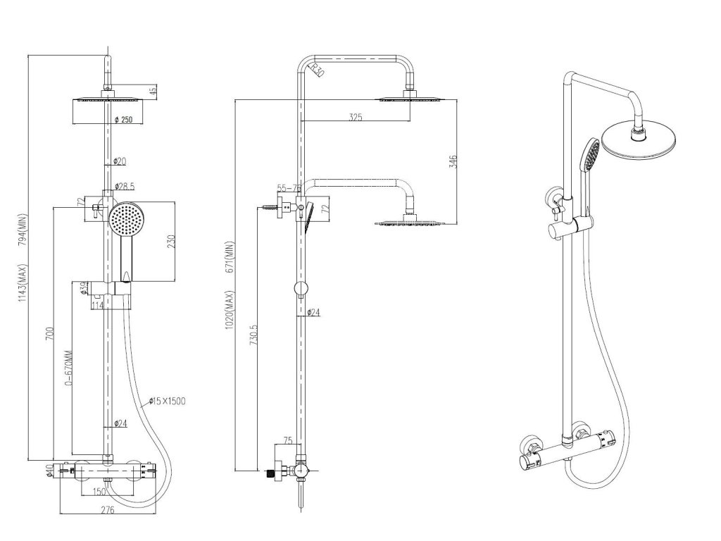 • Regulovateľná výška hlavovej sprchy 671 - 1020 mm