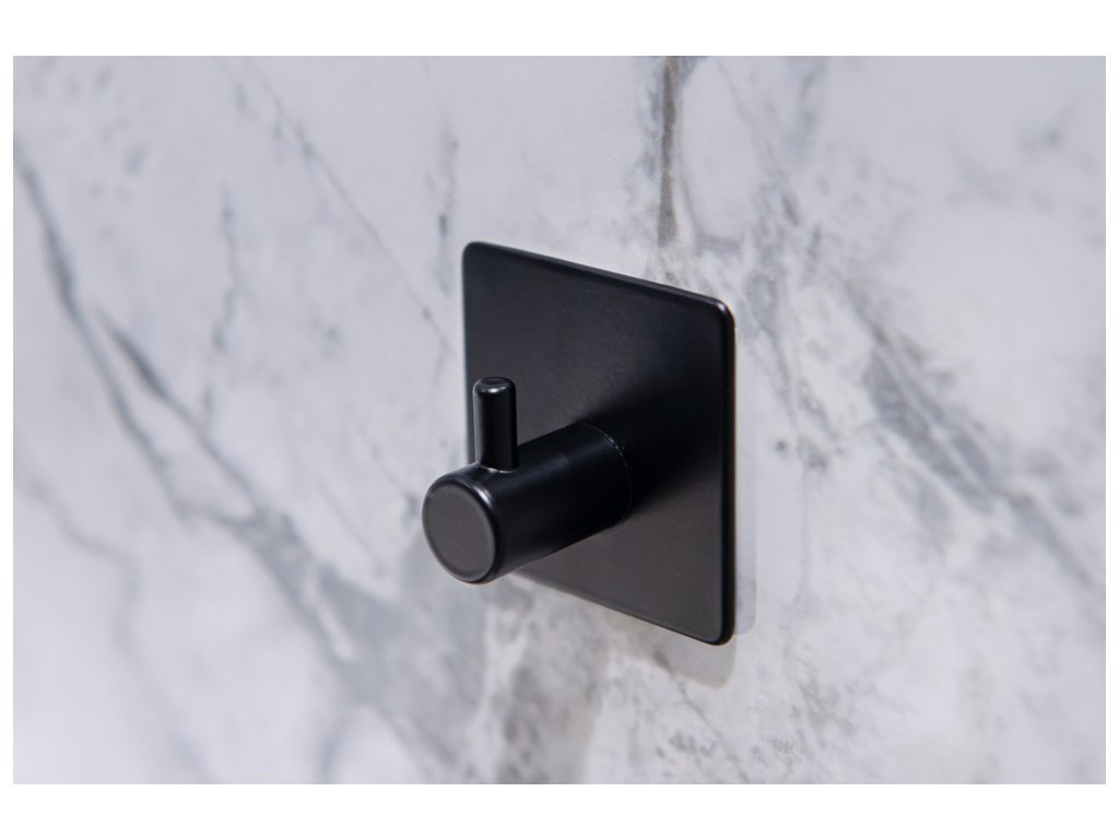 Hranatý vešiak - háčik z kvalitnej, čierno lakovanej, ocele Najväčšou výhodou tohto vešiaka je jednoduché lepenie na obklady pomocou veľmi silnej 3M pásky. Samolepiace kúpeľňové doplnky sú ideálnym riešením, pokiaľ nechcete vŕtať do obkladov. Veľmi kvalitná lepiaca páska 3M priľne k rôznym povrchom a umožňuje ľahké odstránenie doplnkov bez zanechania stôp či poškodenia. Jeho maximálna nosnosť je 4 kg.