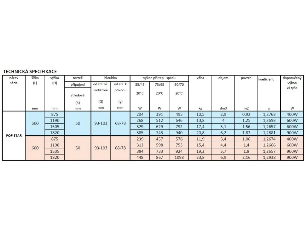 Radiátory sú dodávané BEZ vykurovacej tyče, za rozmerom je iba uvedený vhodný výkon tyče pre patričný rozmer. Štandardná farba C35 white silk (biela lesklá).