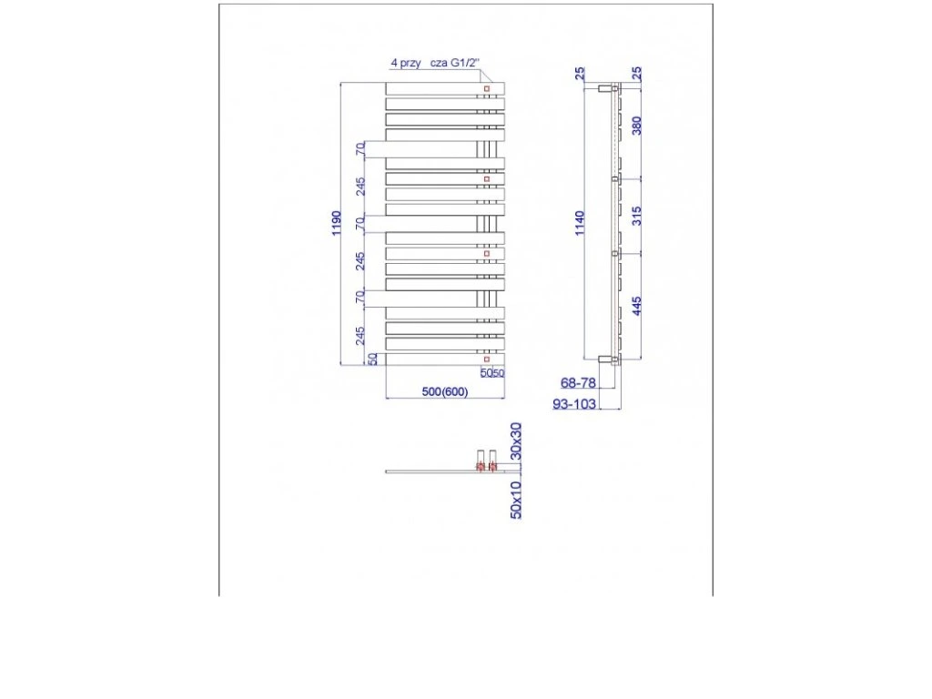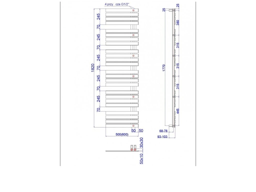 - 500 × 1505 mm, výkon 629 W, vykurovacia tyč 600 W