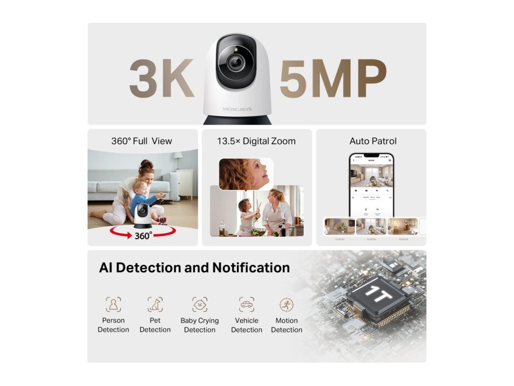 Domáca kamera Mercusys MC230 s rozlíšením 5 Mpx poskytuje ostrý 3K obraz, 13,5-násobný digitálny zoom a 360° rotáciu na pokrytie celej miestnosti. Inteligentná detekcia pohybu, zvuku a objektov zaručuje, že váš domov bude vždy pod kontrolou.