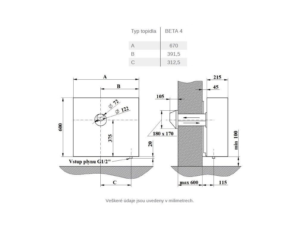 • spaliny sa odvádzajú cez vonkajšiu stenu otvorom s priemerom 122 mm