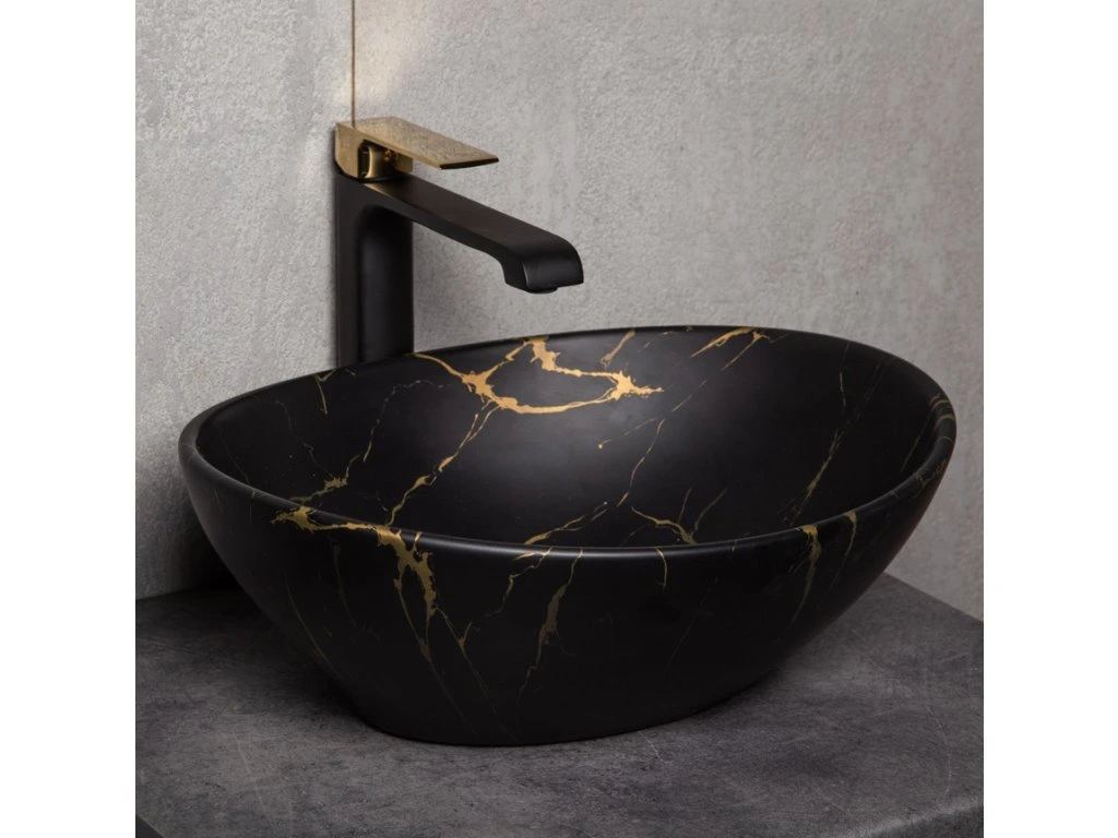 - dizajnové umývadlo v čiernej farbe so zlatým mramorovým dekorom