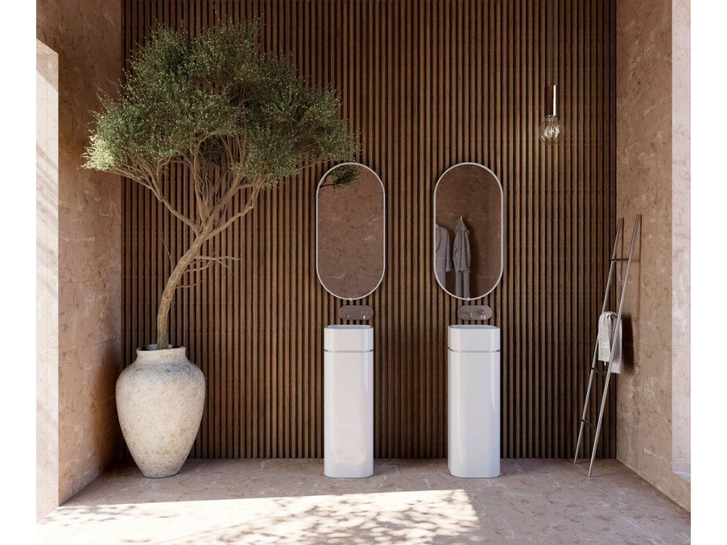 OKE aj HAKO sú k dispozícii aj vo verzii s podstavcom. Tento prvok skrýva inštaláciu, vytvára jednotný vertikálny tvar od umývadla až po podlahu a dodáva celku charakter samostatného objektu. Vďaka tomu sú oba modely vhodné do kúpeľní, kde má umývadlo pôsobiť ako výrazný solitérny prvok, ako aj do minimalistických priestorov, ktoré vyžadujú kompaktné a esteticky jednotné riešenie. Zostáva len vybrať tvar a farbu, ktoré najlepšie podporia celkový koncept interiéru.