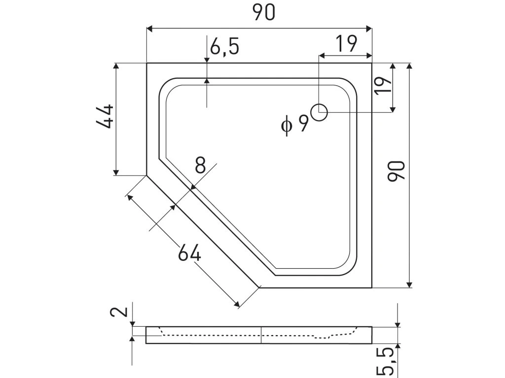 - rozmery sprchovej vaničky - 90 x 90 x 5,5 cm (hĺbka 2 cm)