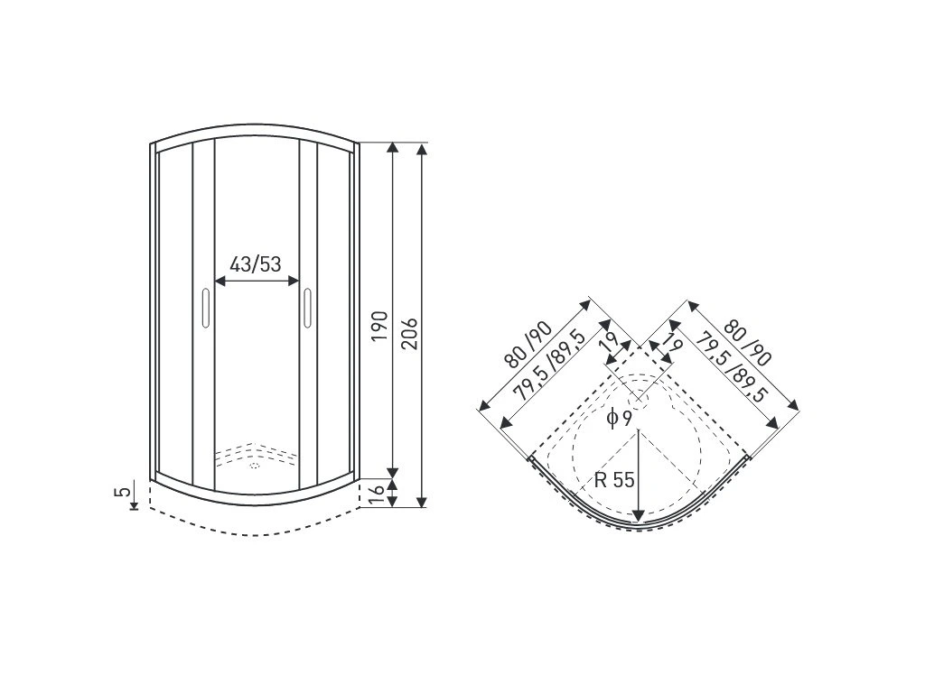 Tabuľka rozmerov sprchového kúta Intro