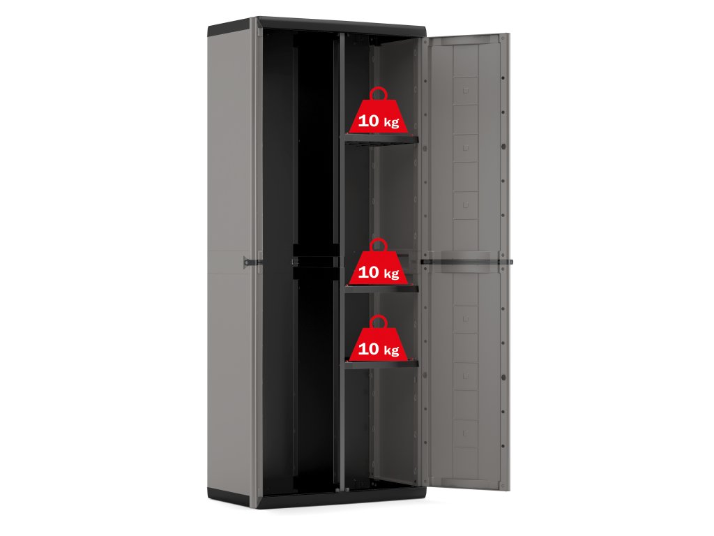 Potrebujete úložný priestor, ktorý sa prispôsobí rôznym typom zariadení? Plastová úložná skriňa Keter Jolly Utility ponúka dômyselné rozdelenie priestoru - jedna polovica je vybavená nastaviteľnými policami s nosnosťou 10 kg, druhá polovica umožňuje uložiť dlhé predmety. Ideálna voľba do dielne, pivnice a technickej miestnosti, navyše sa dá uzamknúť visiacim zámkom.