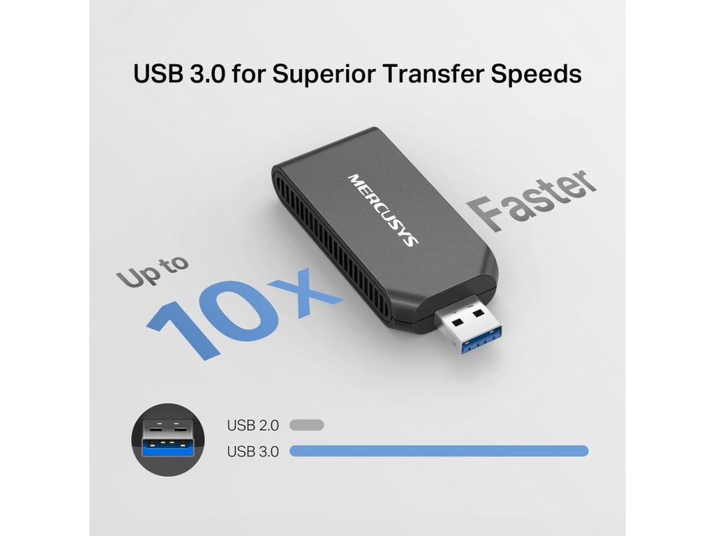 Zariadenie TP-Link Mercusys MA70XM využíva výhody štandardu 802.11ax na zabezpečenie vyššej priepustnosti a efektívnejšieho využívania šírky pásma. Vďaka technológiám MU-MIMO a OFDMA dokáže adaptér obslúžiť viacero zariadení naraz bez preťaženia alebo oneskorenia, čo oceníte pri streamovaní, hraní online hier alebo práci z domu. Rozhranie USB 3.0 poskytuje až 10× rýchlejší prenos dát ako rozhranie USB 2.0 a v kombinácii s rozhraním Wi-Fi 6 poskytuje maximálny výkon.